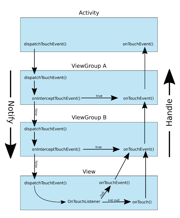 Activity에서 시작된 이벤트 알림이 Activity -> ViewGroup A -> ViewGroup B -> View 순으로 전달하게 됩니다.