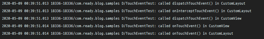 앞서 설명한 것과 같이 부모 뷰인 CustomLayout의 dispatchTouchEvent() -> onInterceptTouchEvent() 순으로 호출되고 이어서 자식 뷰인 CustomView의 dispatchTouchEvent()가 호출됩니다. 그리고 별도의 TouchListener를 등록하지 않았기 때문에 CustomView의 onTouchEvent()가 호출되고 이어서 CustomLayout의 onTouchEvent()가 호출됩니다.