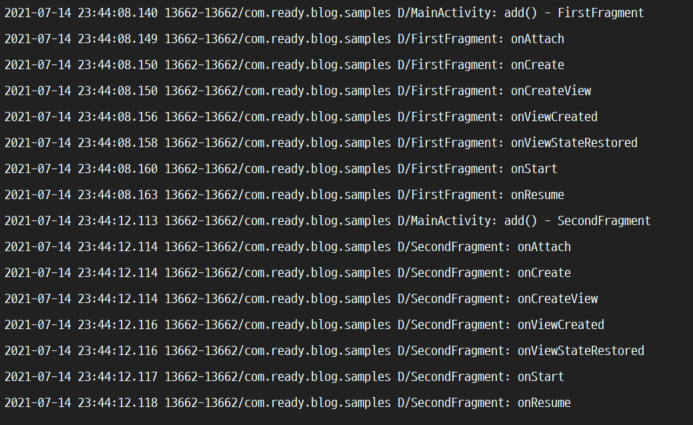 Lifecycle 에 따른 callback 은 위에서 살펴본 순서대로 호출되는 것을 확인할 수 있는데, FragmentTransaction 을 통해 add 하는 경우에는 아래에 깔린 FirstFragment 의 Lifecycle 은 여전히 RESUMED 상태입니다.
