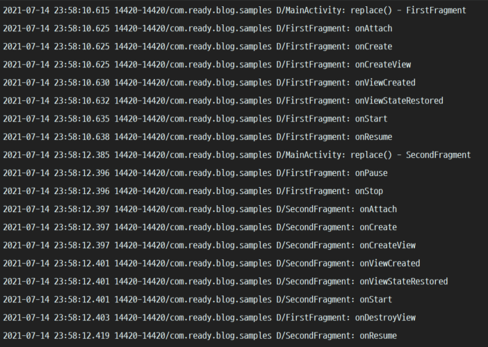 위 사진에서 보듯 FirstFragment 의 Lifecycle 이 onPause() - onStop() 이 호출된 이후에 SecondFragment 가 attach 되고, SecondFragment 의 onStart() 가 호출되고서야 FirstFragment 가 Destroy 되고, 그제서야 SecondFragment 의 onResume() 이 호출됩니다.