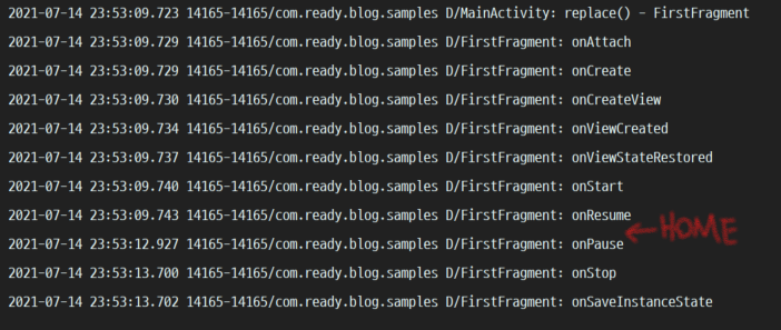 이번에는 Fragment 가 화면에 보여진 이후 홈 버튼을 통해 화면을 벗어났을 경우입니다.